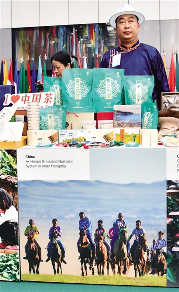 5月22日,在意大利罗马的联合国粮农组织总部,内蒙古阿鲁科尔沁草原游牧系统的代表展示当地产品。联合国粮农组织22日在该机构位于罗马的总部举行2023年全球重要农业文化遗产系统授证仪式,向新认定的24个重要农业文化遗产地颁发证书。中国4地被授予证书,分别是河北涉县旱作石堰梯田系统,福建安溪铁观音茶文化系统,内蒙古阿鲁科尔沁草原游牧系统和浙江庆元林-菇共育系统。摄影/新华社记者 金马梦妮