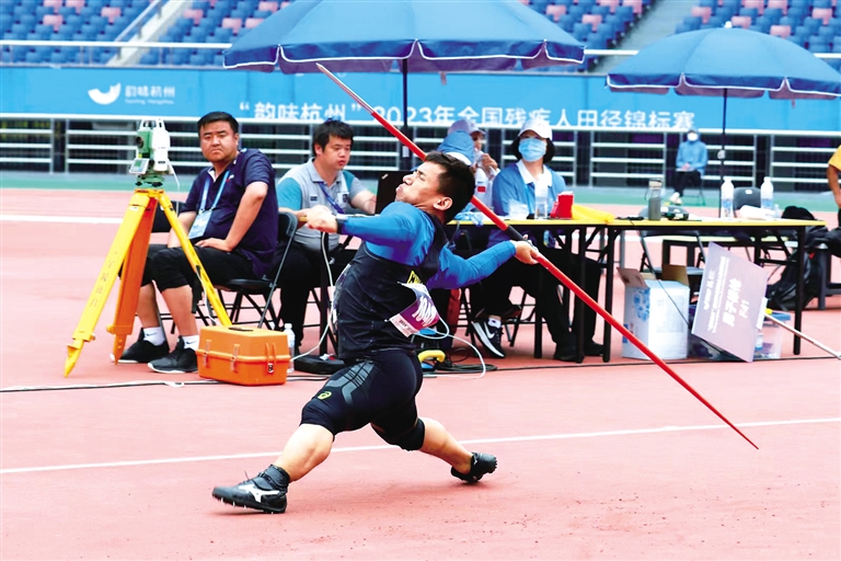 5月28日,记者从内蒙古自治区残联获悉,5月24~27日,2023年全国残疾人田径锦标赛在杭州举行,内蒙古自治区代表队取得5金3银1铜的好成绩。其中,张振东取得男子400米T37、男子200米T37、男子100米T37三项第一名;孙鹏祥取得男子标枪F41第一名、男子铅球F41第三名;孟根吉米素取得女子铁饼F41第一名并打破原纪录;斯庆塔娜取得女子铅球F54/F57第二名;王子璇取得女子跳远T20第二名;周生平取得男子铅球F20第二名。图为内蒙古运动员孙鹏祥在男子标枪F41比赛中。文·摄影/草原全媒·北方新报记者 刘 惠