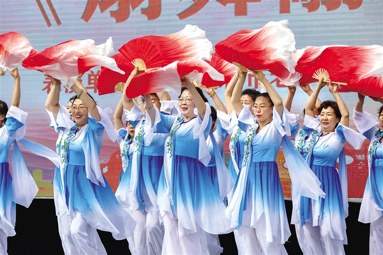 5月28日,在启动仪式上,呼和浩特市老干部活动中心舞蹈队表演健身秧歌《扇舞翩翩》。当日,由呼和浩特市体育局主办的“全民共舞 乐享健身”2023呼和浩特市全民广场舞大赛启动仪式在新华广场举行。本次大赛将进行10场海选,各分赛场冠军队伍于9月30日进行总决赛争夺。该活动旨在丰富呼和浩特市广大群众的体育文化生活,营造全民健身氛围,提升群众健康水平。摄影/草原全媒·北方新报首席记者 牛天甲