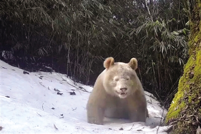 2019年4月,四川卧龙国家级自然保护区内,海拔2000米左右的一台野外红外触发相机首次摄录下一张白色大熊猫的侧影。此后近两年的时间里,红外触发相机拍到了这只白色大熊猫所有影像,或雪地漫步,或“打坐思考”,它穿过密林和小河沟,给人们留下的都是一个背影,或是一闪而过的臀背部。