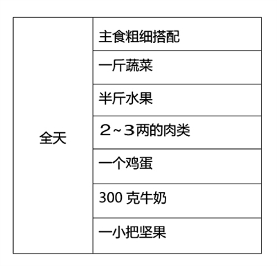 除了每餐搭配要合理,还要保证每天食物的总量充足,具体可以参考最新版的中国居民平衡膳食宝塔。要满足每天一斤蔬菜、半斤水果、2~3两的肉类、一个鸡蛋、300克牛奶和一小把坚果,主食注意粗细搭配。