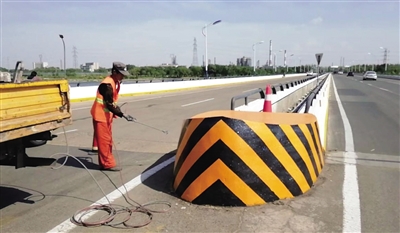 “刷新”后的桥梁防撞墩如同涂上了一层“保护膜”,可以有效防止遭受风吹日晒,延长使用寿命。经统计,此次共涂饰19个防撞墩,涂饰面积约200平方米。目前,市区内6座桥梁防撞墩油漆涂饰工程已全部完工。