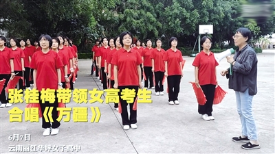 出发去考点前,张桂梅与师生们合唱《万疆》,为考生加油打气(如图)。
