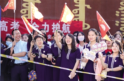 考试结束,一些妈妈身穿旗袍或手捧寓意一举夺“葵”的向日葵花束,等待自己的孩子走出考场……