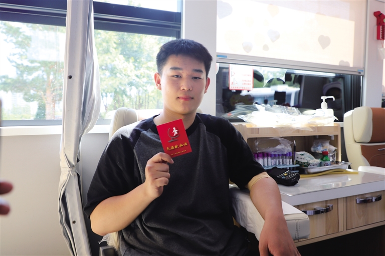 高中毕业生李嘉俊当日来内蒙古博物院参观,经过献血车时,他好奇地驻足,随后在志愿者的指导下登记信息,顺利通过体检后,他走上献血车进行了人生中首次无偿献血。成功献血300毫升后,他开心地说:“一次与众不同的体验,很有意义。”
