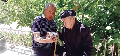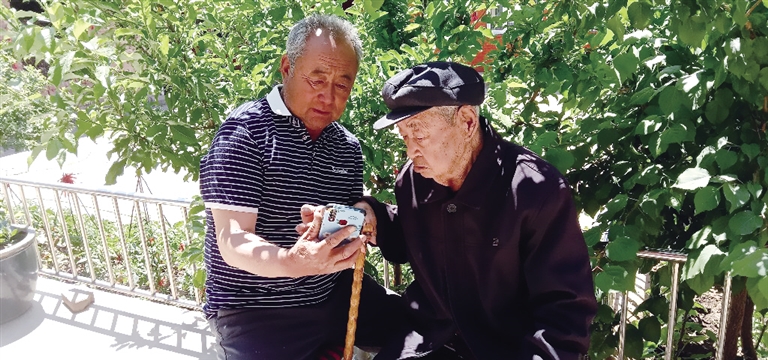 6月15日,在呼和浩特市托克托县伍什家镇大圐圙村,村民吴二月正在院子里陪92岁的老父亲聊天。有孝顺的儿子陪在身边,老人高兴得像个孩子。