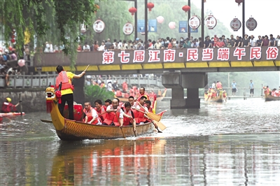 6月18日,农民代表队在南浔区和孚镇民当村进行龙舟比赛。当日,浙江省湖州市“我们的节日·端午”暨第七届江南·民当端午民俗文化旅游节在南浔区和孚镇民当村开幕,来自南浔区各个乡镇的农民选手在河道中赛龙舟、划菱桶,体验传统端午民俗。