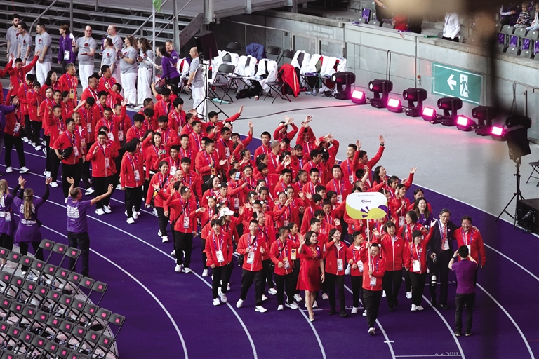 运动员入场仪式中,来自四川的轮滑选手缑海洋在中国代表团前方举牌引导队伍入场。中国退役的网坛名将李娜与另外7名旗手将国际特奥旗帜带入场地。中国队体操教练高成双代表运动会全体教练员在开幕式上宣读参赛誓言。德国网球特奥运动员索菲·伦斯曼点燃圣火。