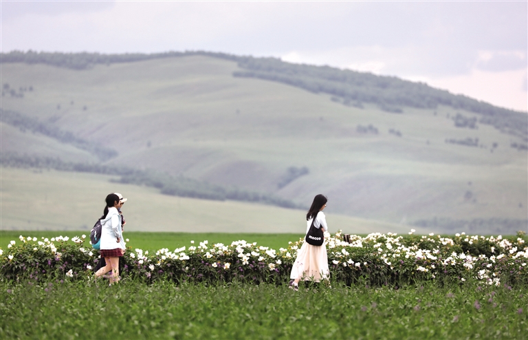 夏日时节,内蒙古草原绿意盎然、景色宜人,蓝天、白云、绿草、花海构成一幅幅美丽迷人的画卷。 (据新华社报道)