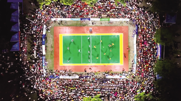 每当有9人排球赛举行,附近的父老乡亲、男女老少便早早到场占座,有的自备板凳,有的席地而坐,甚至树上、屋顶上也都是人。他们敲锣打鼓为自己的主队助威,现场气氛十分火爆。自媒体也闻风而动,现场多个机位直播。