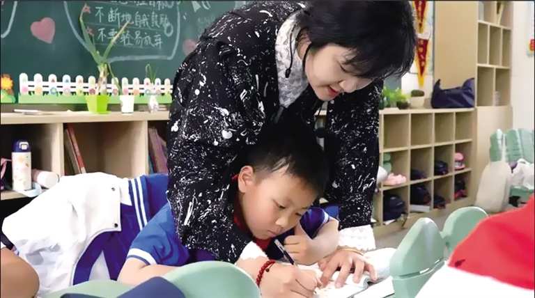 出生于1991年的朱文洁,已有近10年的教学经验了。她曾在安徽滁州和江苏淮安工作,2019年才来到车站小学。从初中转向小学,对朱文洁来说是挑战,“给一年级的小朋友上课,他们完全听不懂我说的话。”面对瞪着眼睛不知所措的小朋友,她内心疑惑:是不是自己的教学方法有问题,怎么办?她想了个招,用视频记录每一节课,回家后认真分析,再复盘检验教学成果。