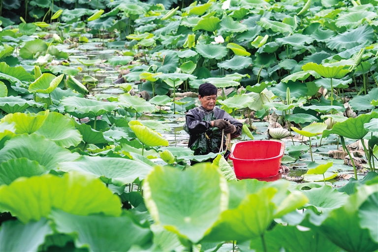 7月19日,在南县华阁镇光复渔村,村民在采收藕根。盛夏时节,位于洞庭湖腹地的湖南省益阳市南县种植的菱角、芡实、莲蓬、藕根等多种水上作物进入成熟期,为保证产品新鲜,当地农户每天上午在塘内集中采收后第一时间送至市场。摄影/新华社记者 陈思汗