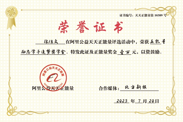 得知获奖后,张佳文很激动:“感谢阿里巴巴天天正能量和北方新报的支持与帮助,我一定不辜负大家的期望,认真努力读书,踏踏实实做人,为父母提供更好的生活条件,回馈社会。”