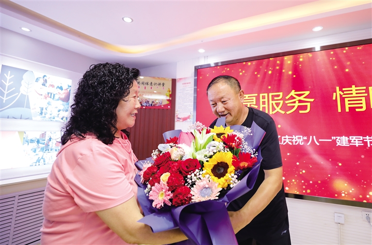 7月31日,呼和浩特市清泉街社区工作人员为退伍老兵送上祝福。在八一建军节来临之际,该社区举行“志愿服务 情暖八一”活动,为退伍老兵们送上米面油等慰问品,志愿者为其免费理发、义诊,送上暖心关怀。摄影/草原全媒·北方新报首席记者 牛天甲 实习生 尤景熙