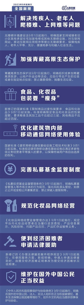 9月,一批重要新规开始施行:推进无障碍设施建设,让残疾人、老年人生活“无碍”;规范化妆品网络经营;对困难群体的保障更加有力……法治更进步,生活更美好。(据《人民日报》)