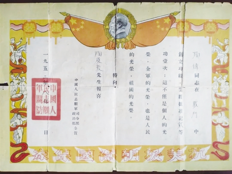 在抗美援朝胜利前夕,陶伟的飞机被美机击中21发炮弹,虽然飞机关键系统没有被打坏,但座舱盖被打爆,形成的碎片在他的脖子、手臂、大腿等近40处留下永久的印记。1953年,朝鲜停战协定签订后,陶伟的战斗二等功喜报也寄回了家。母亲专门用玻璃相框把喜报装裱后,挂在家中最显眼的位置。陶伟说,这是自己给母亲最好的答案,也是给祖国母亲最好的回答。
