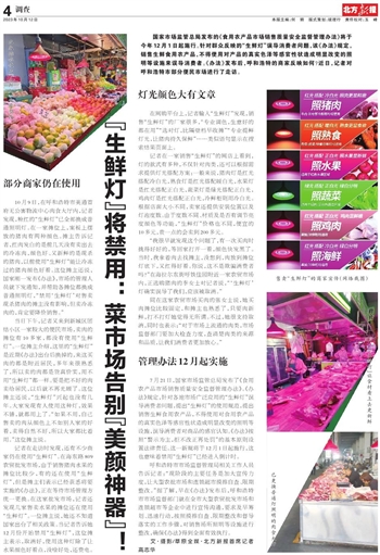 7月21日,国家市场监管总局发布了《食用农产品市场销售质量安全监督管理办法》。《办法》规定,针对各地市场广泛应用的“生鲜灯”误导消费者问题,提出“生鲜灯”的使用规范,提出销售生鲜食用农产品,不得使用对食用农产品的真实色泽等感官性状造成明显改变的照明等设施,误导消费者对商品的感官认知。《办法》按照“警示为主,拒不改正再处罚”的基本原则设置法律责任。这一新规将于12月1日起施行,这也意味着禁用“生鲜灯”已经进入倒计时。
