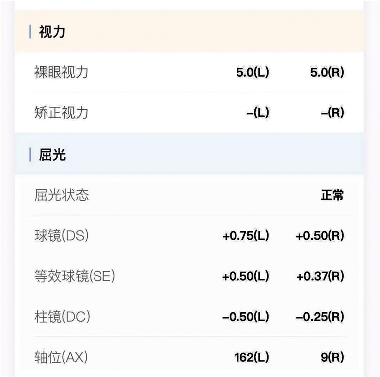这里要提醒各位家长的是,对于视力检查报告,大家不能只关注“裸眼视力”的数值,还得结合屈光项目中的“等效球镜”综合判断。