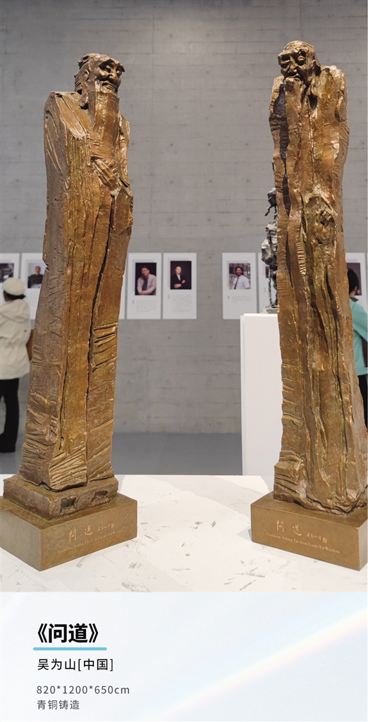 一入馆,抬眼便能看见《神遇——孔子与苏格拉底的对话》。依次看去,风格迥异的国内外经典雕塑作品,展示出中西方文化的交融和碰撞。作者包括艺术史上赫赫有名的西方大师,如阿历山德罗斯、米隆、米开朗基罗、罗丹、马约尔,也有吴为山、曹春生等代表东方文化的一批雕塑大家。在这些雕塑精品中,有抽象简洁的,有夸张浪漫的……每件雕塑作品下都好似住着一个灵魂,表达着情感,诉说着哲理。