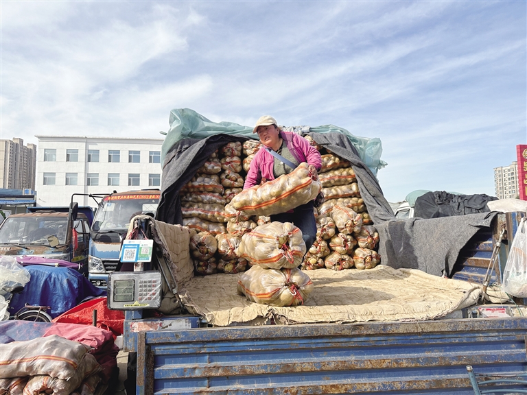 10月17日,记者来到呼和浩特万惠农贸市场,这里的冬储菜销售专区人流如织,20多辆运输车上满载着大白菜、土豆、大葱、芥菜等。前来采购冬储菜的市民或推着推车,或骑着三轮车、自行车,将一袋袋冬储菜运回家,还有不少年轻人开车帮着父母拉菜。