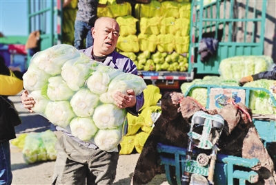 “菜价很便宜,我买这一麻袋大白菜,有七八十斤,只要25元,折算下来只要3毛一斤。还有大葱,一大捆才20多元。我还买了一袋芥菜,60多斤33元。”市民孙仙娥和老伴儿一边将购买的冬储菜往三轮车上装,一边和记者分享储菜的妙处。她说,到冬天最冷时菜价会涨,现在冬储菜大量上市,购买最实惠。冬储菜一部分储存在阴凉处,剩下的腌成咸菜,整个冬天都够吃。