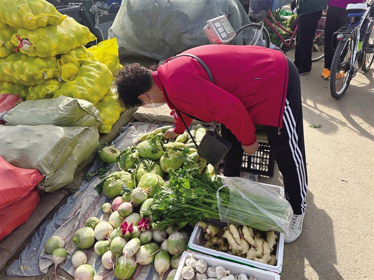 10月17日,在保全庄批发市场,市民张静蕾正在购买白菜和萝卜,她对记者说:“老辈人购买冬储菜图个回忆,年轻人则选择品种多样的新鲜蔬菜。”