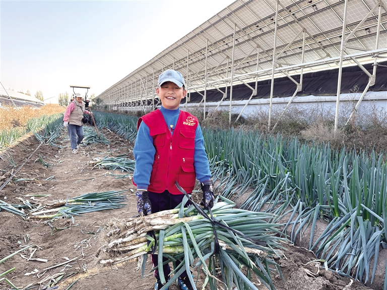 一只只小手,沾满了大葱味儿,味道有些刺鼻,干劲却依旧十足,慢慢地,手上动作熟练起来,孩子和家长分工协作,一捆捆大葱打包完成,整齐地摆放在地头,等待售卖。