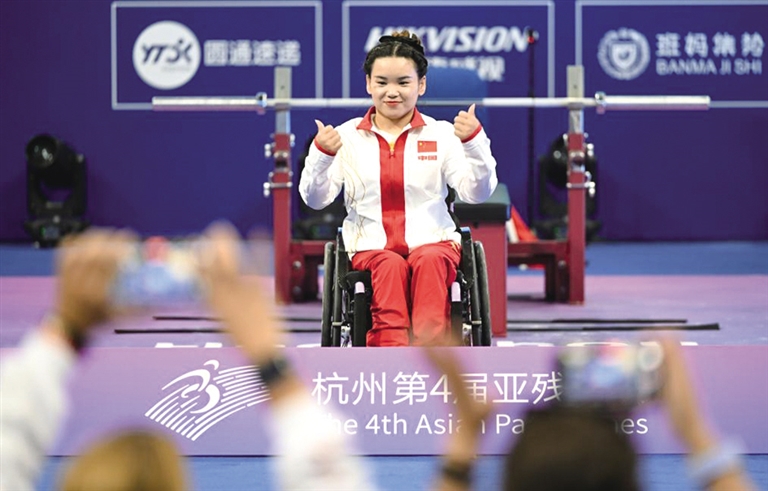 残疾人举重项目在1964年东京残奥会上首次亮相。残疾人举重比赛中,运动员需要平躺在举重床上,直臂取下杠铃,屈臂到胸前停顿,之后再次举起。对运动员来说,“躺下”正是以另一种形式昂首“站立”,他们用双手举起梦想,也举起了更加闪耀的人生。