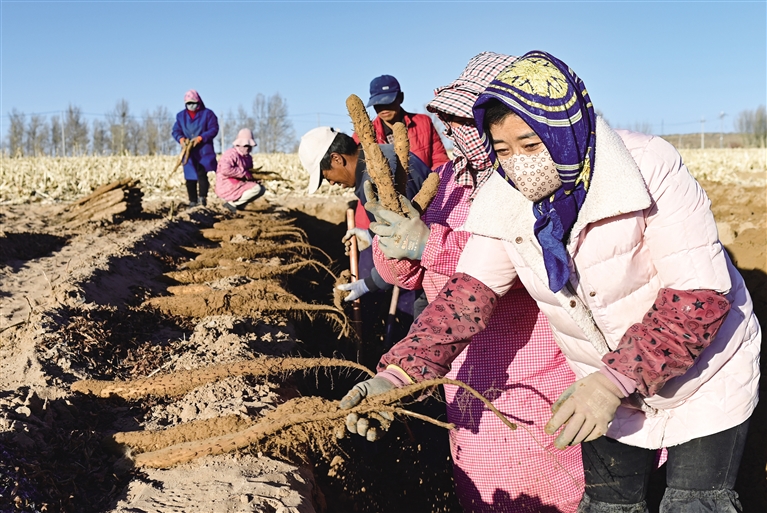 11月12日,在鄂托克前旗城川镇章昂希里村的沙地农田,农民采收白玉山药。近年来,地处毛乌素沙漠腹地的鄂尔多斯市鄂托克前旗通过“沙漠土壤化”技术,对50余万亩沙地进行生态修复,引导农民在改良后的沙地里种植白玉山药、胡萝卜、马铃薯等经济作物,发展特色沙地种植业,在固沙防风的同时,带动农民增收致富,助力乡村振兴。摄影/王 正