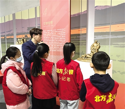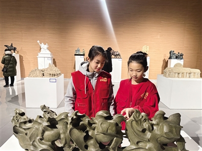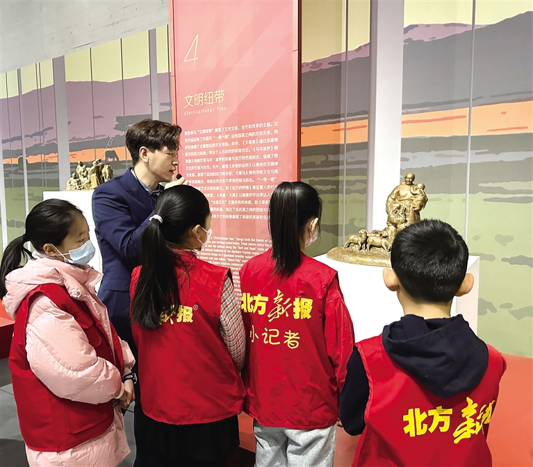 一走进艺术馆大厅,小记者们就被形态各异、造型多样的雕塑吸引了。在讲解员的带领下,大家先后参观了“艺术经典 时代交响”“文明之境 映照相辉”“中华文化 博大和合”系列雕塑作品和“守望北疆”内蒙古雕塑艺术展厅,从中体会不同文明间的交流互鉴和优秀传统文化的绚烂多彩,大家认真倾听、思考、观察、记录,并讨论着……