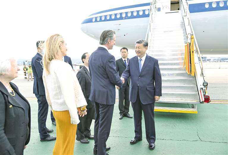 习近平乘坐专机抵达旧金山国际机场时,受到美国加利福尼亚州州长纽森、财政部长耶伦等美方代表热情迎接。