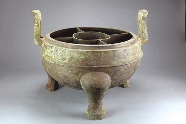 商周时期,铜鼎一直被视为最为重要的国家礼器。进入西汉后,铜鼎又回归了最初受火煮食的功能。想吃不同种类的肉,又不想让各种食材混在一起,精致的西汉人就设计了这种分格铜鼎,不同食材分格来煮,绝不串味。主打就是一个:讲究!