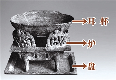 中国古代称调味品为染。在染器的耳杯中放入调味品,下面的炉进行加热,用来满足当时人们喜爱热食的习惯。