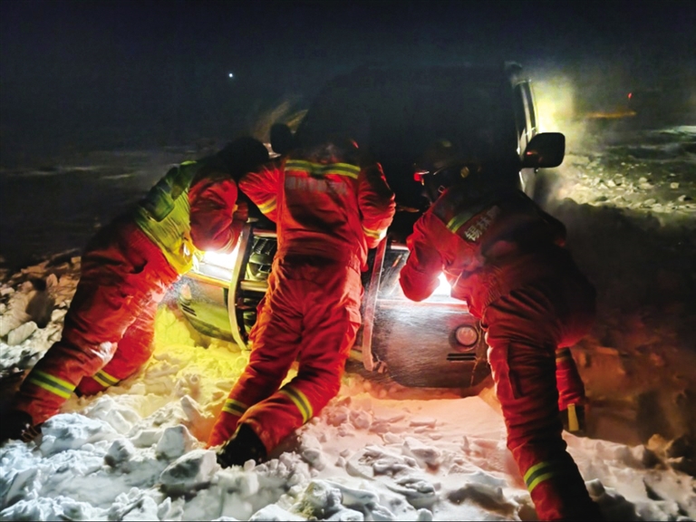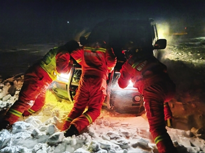 11月23日傍晚,锡林郭勒盟东部地区持续出现“风吹雪”天气,狂风卷着大雪覆盖了路面,能见度极低,行人举步维艰,车辆大量滞留。18时19分,锡林郭勒盟消防救援支队接到群众报警,称有两辆汽车在东乌珠穆沁旗额仁高毕苏木遇到“风吹雪”恶劣天气,车内4名群众被困,车辆无法驶出。锡林郭勒盟消防救援支队迅速指派乌拉盖管理区消防救援大队出动1车7人赶赴现场,由于现场风力强劲,能见度低,车辆行驶缓慢,搜救工作进行得十分困难。消防救援人员通过不间断的电话联系,终于在40分钟后找到被困人员。在恶劣的环境下,救援人员一边用车辆牵拉,一边人力除雪推车,最终艰难地将车辆推出雪窝。经过近3个小时的救援,受困车辆和人员脱离险境,被成功转移到安全地带。彼时,消防救援人员身上的战斗服已经结了厚厚一层冰碴,双手早已冻得又红又僵。