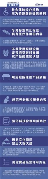 12月1日,一批关系你我的新规开始施行。社会保险经办机构应为特殊群体提供便利,不得使用照明设施误导消费者对食用农产品的感官认知,规范养老机构服务内容……不断进步的法治,保障你我美好生活。