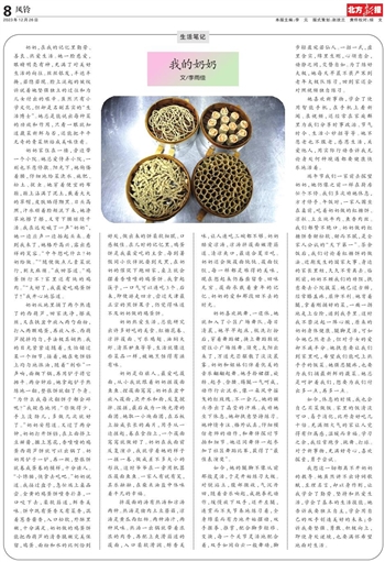 奶奶,在我的记忆里勤劳、善良、热爱生活。她一脸慈爱,眼睛明亮有神,充满了对美好生活的向往。丝丝银发,半遮半掩,若隐若现。脸上泛起的皱纹诉说着她坚强独立的过往和为儿女付出的艰辛。虽然只有小学文化,但却是名副其实的“生活博士”。她总是能说出每种菜的功效和作用,只看一眼就知道蔬菜新鲜与否,还能把平平无奇的青菜烘焙成美味佳肴。