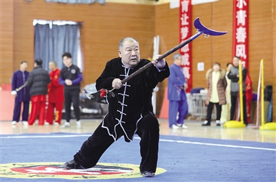 12月27日,选手正在进行武术展示。当日,由呼和浩特市体育局主办的呼和浩特市2023年武术项目展演及志愿服务指导培训活动举行,来自9个旗县区的近百名武术爱好者齐聚一堂,互相交流展示,切磋武艺。摄影/草原全媒·北方新报首席记者 牛天甲