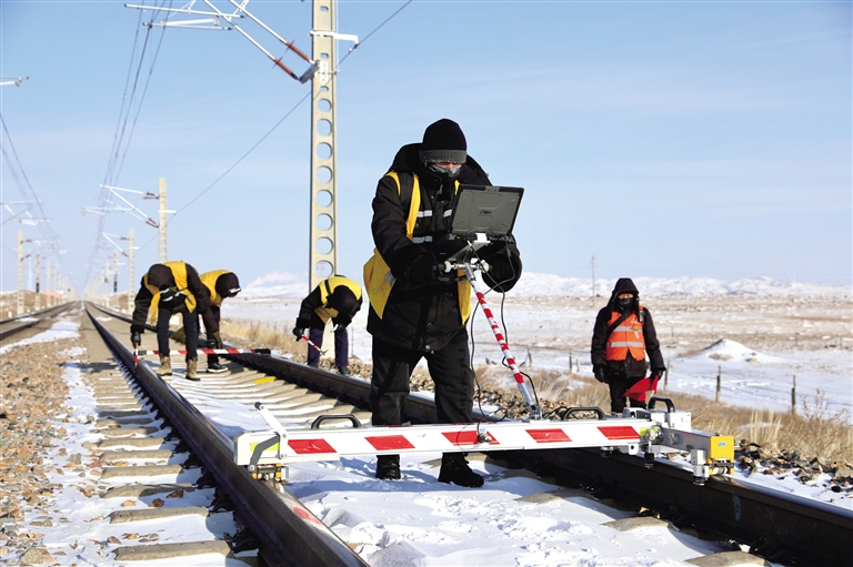 冬季气温低,昼夜温差大,因热胀冷缩的物理特性,加之列车的重载运行碾压,钢轨容易产生裂纹等伤损,为了及时发现病害,确保列车运行平稳和安全,就需要线路工严谨负责地工作。