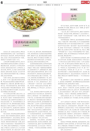 慢工出细活。等色泽成亮黄色的猪油出来后,母亲不时翻动反复熬榨,直到油渣的体积明显缩小,变成金黄色,便关熄灶火,此时煎熬出来的猪油清亮,没有过多杂质。等喷香焦黄的油渣一出锅,我们兄妹几个就趁热拎出一块塞进嘴里当作小吃。那时,母亲多会嘱咐我们,少吃些猪油渣,多喝点水,生怕热气上火。吃不完的油渣也不会浪费,倒入青菜或萝卜丝同炒,香气十足,物尽其用。待熬好的猪油微凉时,母亲将其装入已提前放些盐的陶瓷罐中,搁置半天后,猪油便会凝固为细腻的乳白色,像极了白雪落进了瓷罐里,又像是那时妇女们用的雪花膏,分外漂亮。盖上瓷盖,放阴凉处保存要吃大半年。