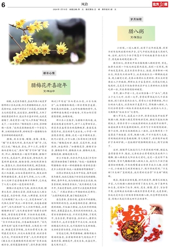 这时,姐姐早已把我们几个弟弟妹妹叫醒,铺盖也叠得整整齐齐。随后,父亲就会让哥哥到院里放两个二踢脚。腊八粥要在太阳出来之前吃,这是一直流传下来的规矩。等热气腾腾的腊八粥端上来,我们几个孩子揉着惺忪的眼睛,不住地嚷嚷着让母亲多放点儿糖。记得一次,小妹嫌自己碗里的糖太少,便不停地哭闹:“不生甜!不生甜!”直到现在,我们有时还会拿“不生甜”调侃她。