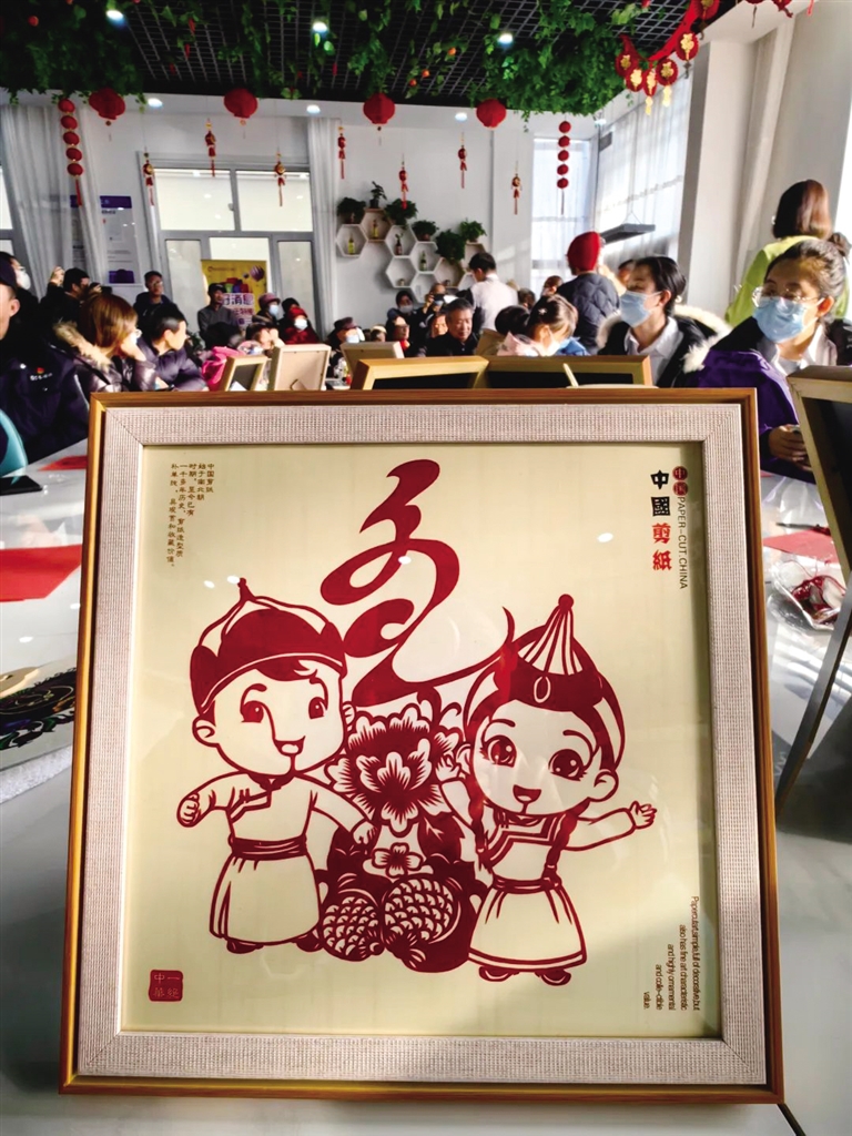非物质文化遗产剪纸第四代代表性传承人崔霞展示了她创作的“十四冬”主题剪纸。“这幅作品,是我将‘十四冬’吉祥物‘安达’‘赛努’和‘十四冬’会徽,以及象征吉祥如意的牡丹花、寓意民族团结的石榴籽等元素结合在一起,用时3天精心设计制作完成。”崔霞说,希望通过非遗作品,为“十四冬”加油助力。