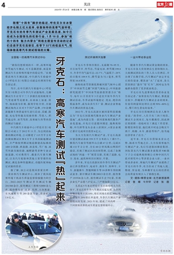 当日,在中汽研汽车检验中心(呼伦贝尔)有限公司冬季汽车试验场内,几辆测试汽车在零下三十多摄氏度的极寒天气里迎着雪花驶来,在冰面上加速、转弯,场面蔚为壮观。据刘学松介绍,目前测试场内正在对5个国产品牌、170余辆新能源车和普通型车进行启动、采暖、除霜、充电等性能及续驶里程、雪侵入、积雪通过性、冰雪驾控、高寒耐久性等内容的测试与验证。