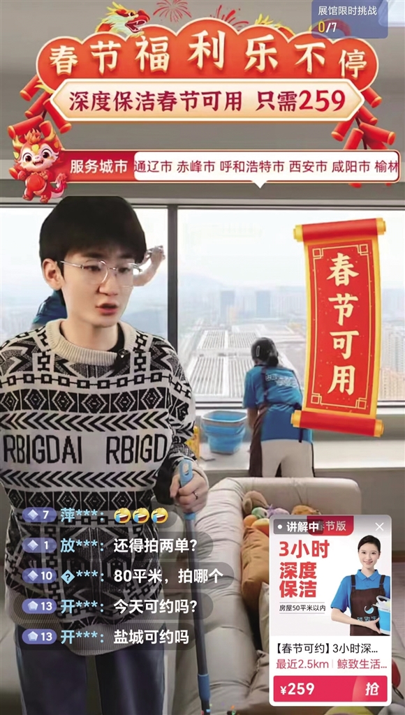 1月22日上午,记者打开多个网络平台看到,鲸致生活·家政保洁、好屋管家家政保洁、嗨趣管家·保洁家电清洁等10多个家政企业均在使用直播促销,推出3小时深度保洁、精细擦窗、全屋换新大扫除等保洁套餐,不少消费者在直播间“囤”保洁。