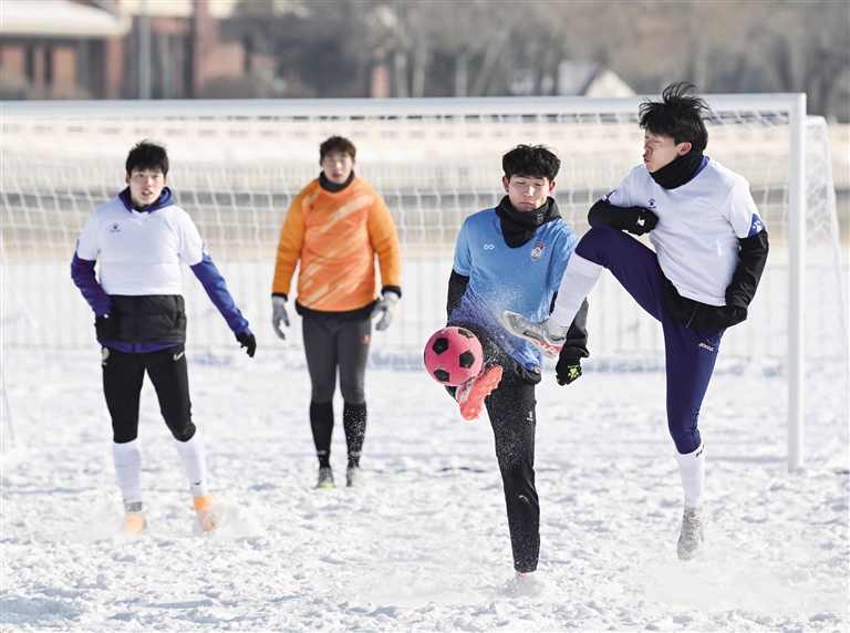 1月27日,选手在比赛中激烈拼抢。当日,2024年呼和浩特市雪地足球锦标赛在东河冰雪场开赛,共有来自呼和浩特地区的22支球队350名选手参赛。比赛旨在推动群众冰雪运动普及与发展,以球会友、以体促旅,弘扬北疆文化,为即将到来的“十四冬”营造浓厚的冰雪运动氛围。