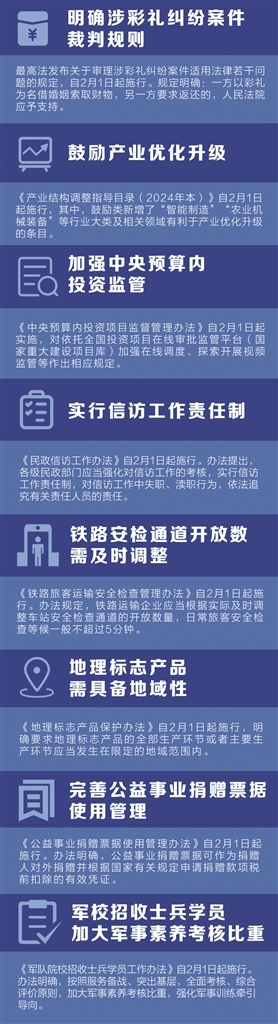 明确涉彩礼纠纷案件的审理裁判规则,规范公益事业捐赠票据使用和管理行为……2月起施行的这些新规涉及法律、金融等领域,进一步护航美好生活。