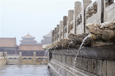 下面说龙。雨季里,“千龙吐水”是太和殿一道奇特的景观。所谓千龙吐水,是指太和殿外集聚的雨水通过排水系统“螭首”吐出。螭,是神话传说中一种没有角的龙。太和殿的台基外部,栏板之下,若干排水口被雕刻成一个个螭首向外伸出。据统计,太和殿的三层台基上共有1142个汉白玉螭首。雨水越大,“千龙吐水”越壮观。