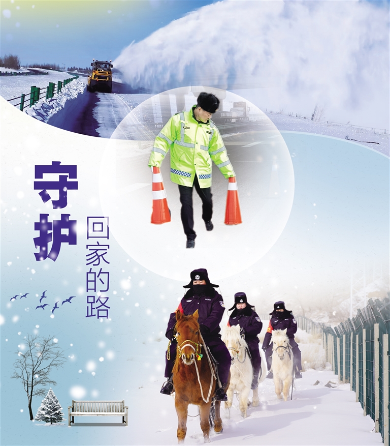 锡林郭勒盟交通运输事业发展中心西乌珠穆沁旗养护分中心进行除雪作业。 内蒙古交通运输综合行政执法总队工作人员巡查京藏高速乌兰察布段,确保24小时“车上路,人在岗”。 锡林浩特铁路公安处正蓝旗车站派出所民警骑马巡逻铁路沿线,将影响列车运行的各类安全隐患消灭在萌芽状态。