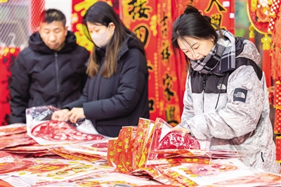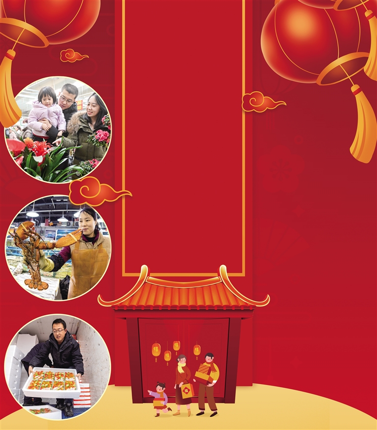 猪牛羊肉、鸡鸭鱼虾、海鲜炒货、蔬菜水果、米面粮油、酒水饮料、窗花春联,还有那喜庆感满满的福字……