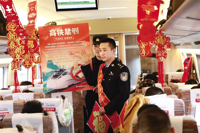 2月5日,包头开往北京北的G2494次列车上张灯结彩,中国结映红了整节车厢,浓郁的年味儿扑面而来。包头铁路民警开展了“高铁动车不吸烟 平平安安过大年”主题禁烟宣传活动,通过真实案例讲解、有奖问答、相关法律解析以及宣传册发放等多种形式,向旅客宣传列车禁烟知识,共建平安列车。