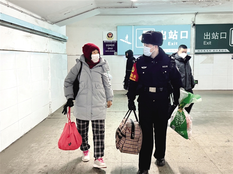 2月6日,70岁的旅客刘女士独自从林东火车站乘车到哈尔滨的儿子家过年。执勤民警见刘女士提拿较多行李,行走不便,主动上前帮助刘女士拿较重的行李物品,并送刘女士至所乘车厢,向列车值乘民警通报情况,请求给予相应照顾。刘女士对民警的帮助表示感谢。